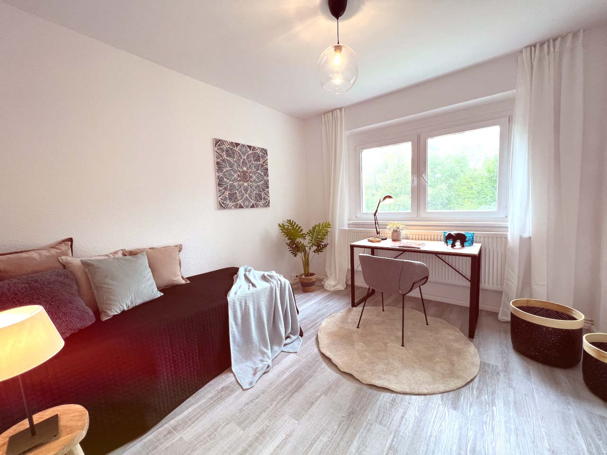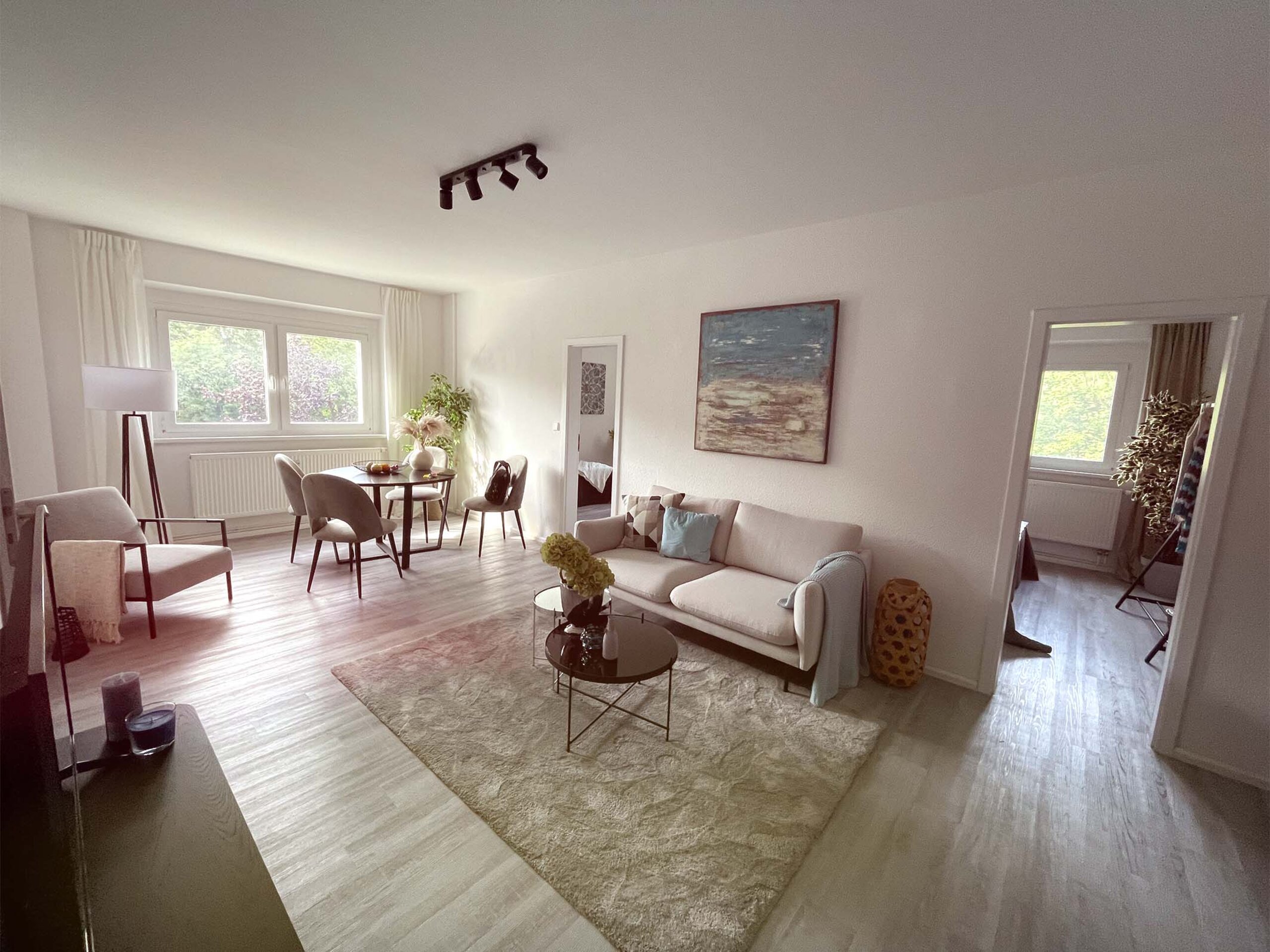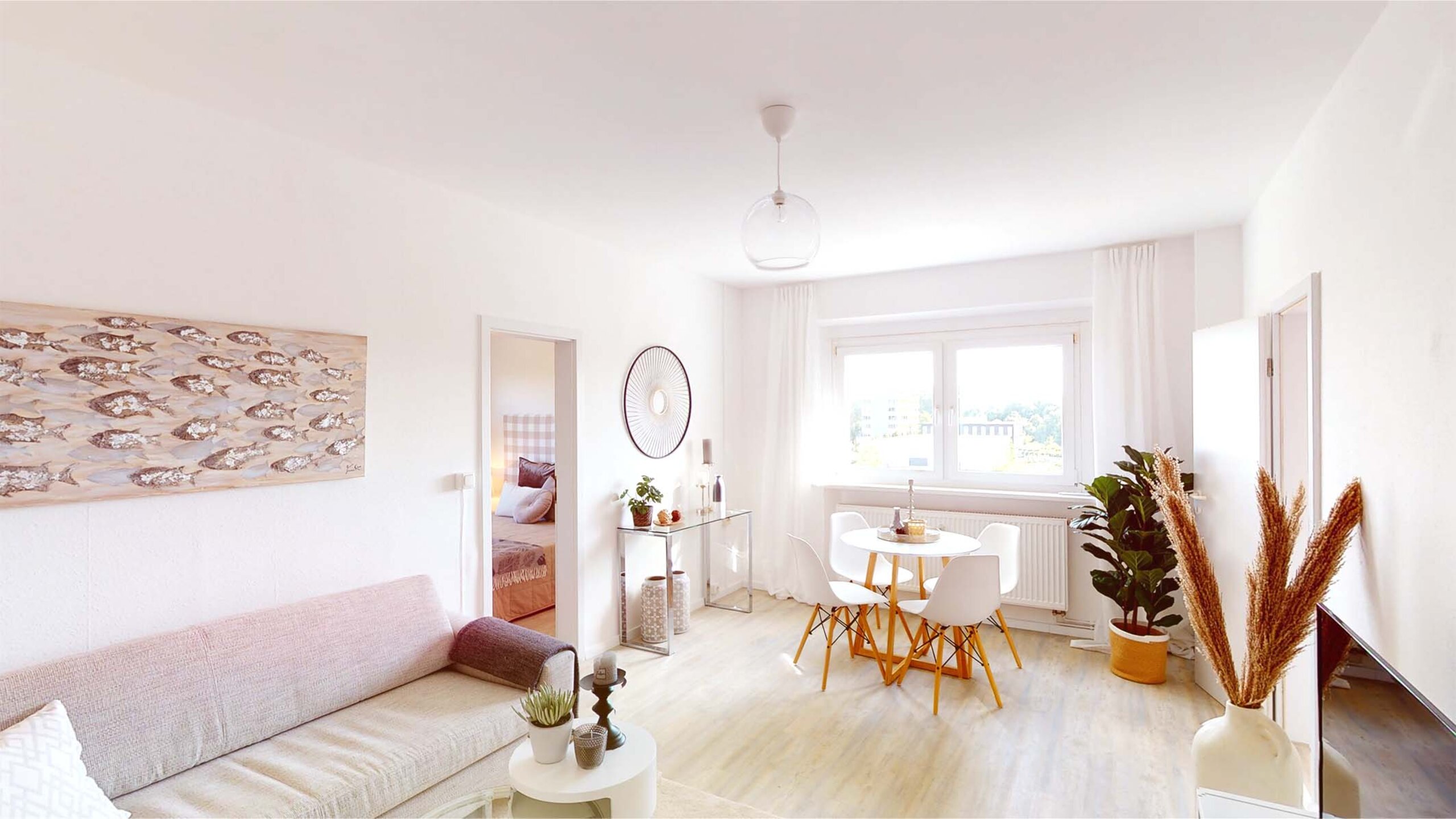 Allein durch die hochwertige Ausstattung mit modernen Böden und Fenstern strahlen die Räume eine dezente Eleganz aus. Alle Wohneinheiten befinden sich im teilmodernisierten Zustand. Mit einem individuellen Einrichtungsstil erhalten die 35-64 m² großen Wohnungen schnell die eigene persönliche Note. Dank der innen- und außenliegenden Balkone lässt sich die frische Brise der nahen Ostsee tanken und der Blick über die großzügige Anlage schweifen.